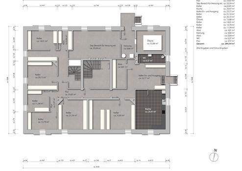 Im Untergeschoss des Anwesens finden sich ein Gewölbekeller mit 6 Räumen, eine Werkstatt, ein Weinkeller, eine Waschküche, ein separates WC sowie mehrere Service- und Abstellräume.
