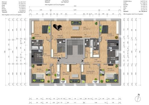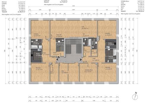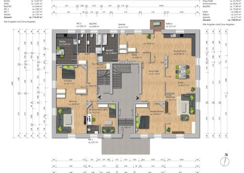 Im Dachgeschoss finden sich zwei 3-Zimmer Wohnungen auf modernem Ausbaustandard mit jeweils ca. 91 bzw. 114 m², ein Büro mit ca. 25 m² sowie ein Loft von ca. 80 m². Deckenhöhe ca. 2,65 m. Das Loft ist derzeit mit der Etagen-Wohnung in der 1. Etage verbunden; verfügt jedoch über einen separaten Eingang. Es ergibt sich eine vermietbare Fläche von insgesamt ca. 900 m².