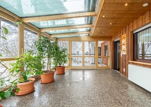 * Heller Wintergarten mit großzügigen Glasfronten, der Wohnbereich und Garten elegant verbindet