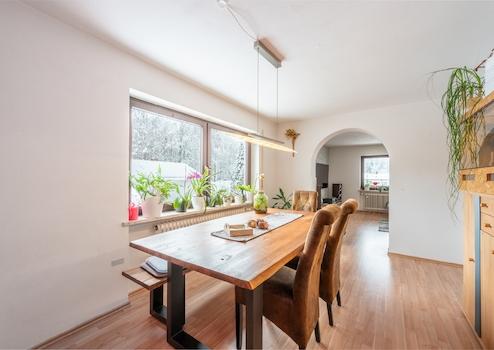 Dieses gepflegte Zweifamilienhaus empfängt Sie über eine überdachte Einfahrt mit zwei Garagen, von der aus Sie direkt in das zentrale Treppenhaus gelangen, das beide Wohneinheiten erschließt. Dank zweier separater ...
