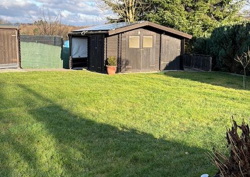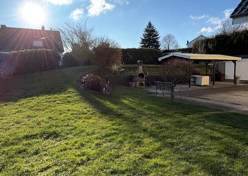 Die Küche bildet einen echten Mittelpunkt des Hauses und überzeugt durch modernes Design, hochwertige Verarbeitung und durchdachte Funktionalität. Die erst rund zwei Jahre alte Einbauküche von Nobilia wurde mit viel Liebe zum Detail geplant und fügt sich harmonisch in das offene Wohnkonzept ein. Der Neupreis lag bei ca. 20.000 €. Ausgestattet mit hochwertigen Markengeräten von Siemens und Bosch bietet die Küche höchsten Komfort im Alltag. Das moderne Induktionskochfeld mit integrierter Dunstabzugshaube sorgt für eine klare Optik und effizientes Kochen, während die großzügige Kochinsel nicht nur zusätzliche Arbeitsfläche schafft, sondern auch als kommunikativer Treffpunkt dient. Besonders praktisch ist die hochgesetzte Spülmaschine, die ergonomisches Arbeiten ermöglicht. Insgesamt präsentiert sich die Küche stilvoll, zeitlos und äußerst hochwertig, ein Raum, in dem Kochen nicht nur funktional ist, sondern richtig Freude macht und der den gehobenen Anspruch des Hauses perfekt widerspiegelt. Große Fensterflächen sorgen im gesamten Haus für viel Tageslicht. Alle Rollläden sind elektrisch betrieben, im Erdgeschoss lassen sie sich bequem per Fernbedienung steuern und bieten zusätzlichen Komfort sowie Sicherheit. Das rund 971 m große Grundstück bietet einen gepflegten, vollständig eingezäunten Garten mit viel Platz, Ruhe und Privatsphäre. Durch die sonnige Lage können Sie den Garten den ganzen Tag über genießen, ob zum Entspannen, Spielen oder für gesellige Stunden im Freien. Ein besonderes Highlight ist die großzügige, überdachte Terrasse, die bei nahezu jedem Wetter zum Verweilen einlädt. Ergänzt wird der Außenbereich durch einen Grillkamin, der den Garten zu einem beliebten Treffpunkt für Familie und Freunde macht. Auch an praktische Details wurde gedacht: Das Kaminholz ist ordentlich und geschützt im Garten gelagert und iederzeit ariffbereit. Die Garage verfügt neben dem Tor zur Straßenseite über einen direkten Zugang in den Garten, was den Alltag besonders komfortabel macht.