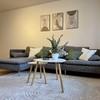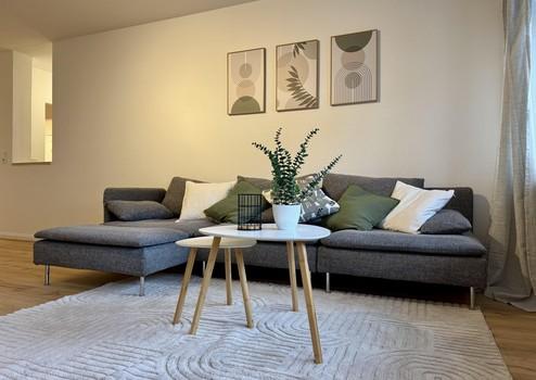 Großes Sofa, Bett 160x200, 2 Schränke, Teppich, Geschirrspüler, Wahlweise Waschmaschine, Küche inkl. elektrische Geräte, Esstisch inkl. 2 Stühle, Deko & Bilder