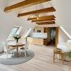 Hoher und offener Ess- und Wohnbereich mit Küche (abtrennbar durch eine Glas-Schiebetür)