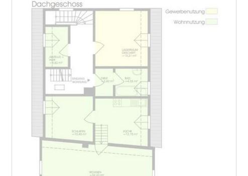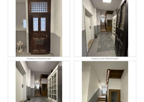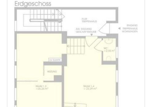 Über das Treppenhaus, mit gesonderten Eingang an der Seite des Gebäudes, gelangt man in die oberen Geschosse mit hauptsächlicher Wohnnutzung sowie einem Lagerraum der Gewerbenutzung.