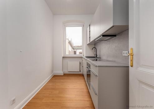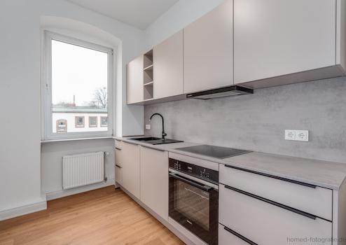 Moderne Einbauküche: Eine vollständig neu eingebaute und mit Markengeräten ausgestattete Küche in zeitlosem Design bildet das funktionale Herzstück der Wohnung.