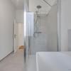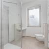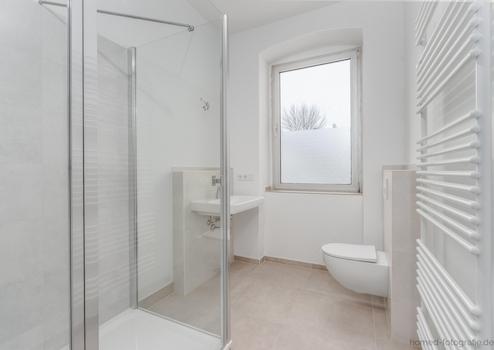 Tageslichtbad der Extraklasse: Das Bad präsentiert sich als moderne Wellness-Oase mit einer großzügigen Glasdusche, eleganten großformatigen Fliesen, einem Handtuchheizkörper und einem Fenster, das für eine helle und freundliche Grundstimmung sorgt.