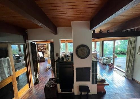 Erdgeschoss: großes offenes Wohnzimmer mit Kachelofen und 2,80 m hoher tragender Holzdecke, offenes Esszimmer, Küche mit separatem Hauswirtschaftsraum, Flur und Garderobe, Gästetoilette, überdachte Südwest-Terrasse mit offenen Kamin vor dem Haus und Terrasse mit Morgensonne hinter dem Haus