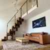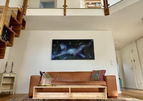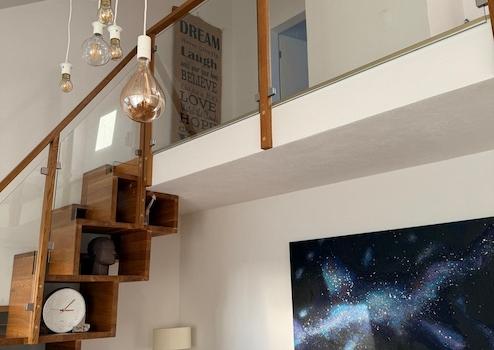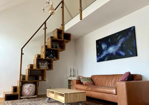 Die Maisonette-Wohnung wurde 2021 renoviert. Der Boden ist mit wunderschönem Eichenholzparkett verlegt. Das Highlight der Wohnung ist die Wohnhalle mit einer Deckenhöhe von bis zu 6 m und der maßgeschreinerten Samba-Treppe als Wohnregal.