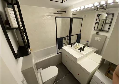 Die Design-Bäder sind ebenfalls mit hochwertigen Geräten, Lady Dusch-WC mit integriertem Bidet und Armaturen in schwarz gebürstetem Metall ausgestattet.