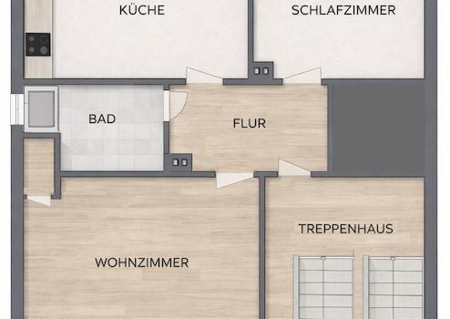 Diese praktisch geschnittene und helle 2-Zimmer-Küch-Bad-Wohnung (2-ZKB) befindet sich im 1. Obergeschoss und bietet mit den ca. 48qm genügend Platz zum Wohlfühlen, idealerweise für ein Paar oder eine Einzelperson. Die Wohnung besteht neben dem dem Flur und dem Duschbad aus zwei geräumigen Zimmern, die sich als Wohnzimmer und Schlafzimmer eignen sowie einer separaten geräumigen Wohnküche.