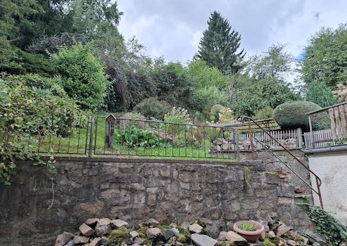 Es sind zwei Zufahrten, Garage und im hinteren Teil des Grundstücks ein Garten mit etwas Hanglage vorhanden.