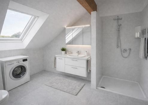 - Neues Bad mit neuen Badmöbeln/-armaturen, Regendusche und Waschtrockner