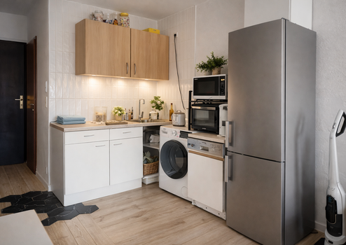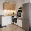 Die offene Küche ist funktional integriert und verfügt über eine praktische Einbauküche mit Stauraum, Spüle sowie Platz für Kühl- und Elektrogeräte. Alles ist kompakt und durchdacht angeordnet.