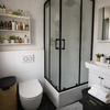 Das modern gestaltete Badezimmer verfügt über eine Dusche mit Glasabtrennung, Waschbecken sowie WC und befindet sich ebenfalls in einem gepflegten Zustand.