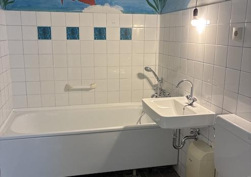 Badewanne, Elektroherd, Breitbandkabelanschluss, Fliesenboden, Warmwasserversorgung dezentral - Durchlauferhitzer, Kunststoff-Bodenbelag, Steinboden, Barrierearme Objektgestaltung, Spüle