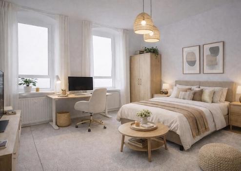 Es handelt sich hier teilweise um maßstabsgetreue Fotos, welche mit KI bearbeitet wurden. So oder ähnlich könnte der Raum nach erfolgter Renovierung aussehen.