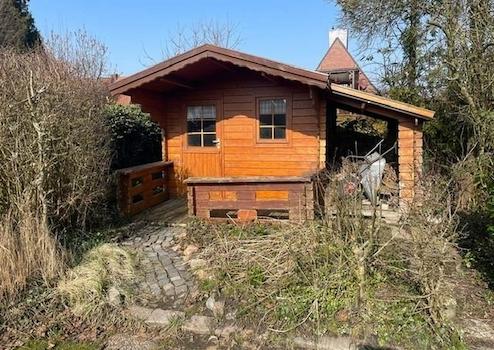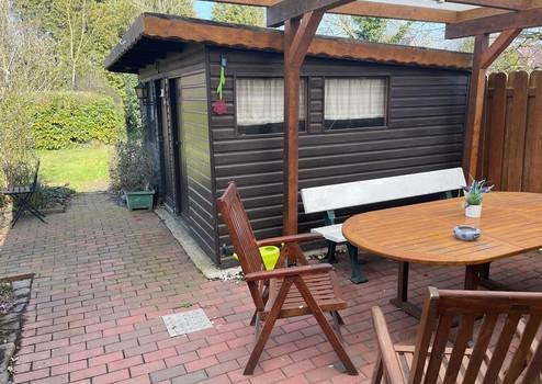 Auf dem 610 m² großen Grundstück findet man einen gemütlichen Gartenbereich mit Gartenhäuschen und einer überdachten Terrasse, auf der man auch bei wechselhaftem Wetter gemütliche Stunden im Freien verbringen kann.