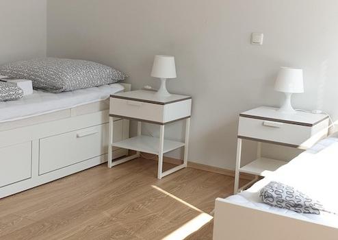 erhellt den Raum in einem natürlichen Licht und verleiht dem Raum ein behagliches Flair. Im Schlafzimmer befindet sich zwei Kleiderschränke sowie zwei Betten und weitere Kleinmöbel, wie z.B. Nachttische.