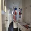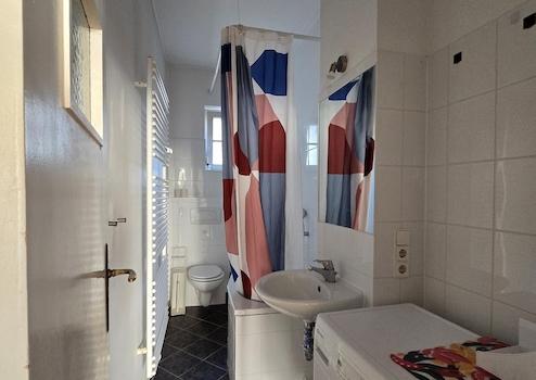 Wanne und Fenster ist gefliest. Die Küche mit Einbauküche hat einen Linoleumfußboden.