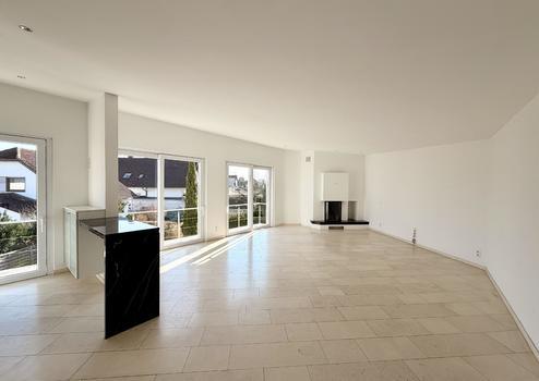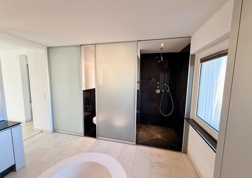 Das Obergeschoss mit Fußbodenheizung bietet eine 3-Zimmerwohnung mit Schlafzimmer, Ankleide, Badezimmer und XXL-Wohnraum mit offener Küche, Kamin, Deckenhöhe bis zu 3,30m und umlaufenden Südbalkon. Ankleide, Schlafzimmer und Badezimmer mit freistehender Wanne, Doppelwaschtisch, bodengleicher Dusche und Bidet sind über Schiebetüren miteinander verbunden.