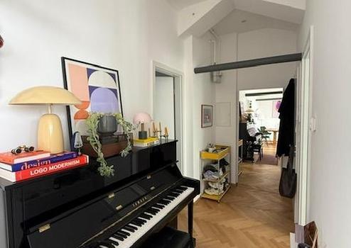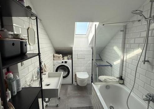 Die gesamte Wohnung ist mit einem Eichenholzparkett versehen, das Badezimmer mit stilvollen Metrofliesen sowie großen, grauen Steinfliesen.