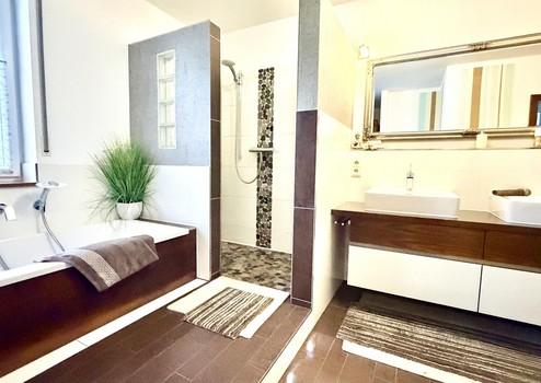 - Bad mit Walk-in-Dusche mit beheiztem Boden, Badewanne mit hochwertiger Echtholzverkleidung, Doppelwaschbecken, Holz-Sauna, exklusive Echtholz-Schreinermöbel, LED-Spotlights und Wandheizung