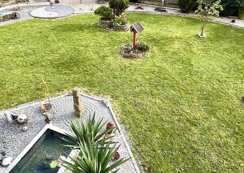 - hochwertige, exklusiv und kreativ gestaltete und bepflanzte Gartenarchitektur mit Feng-Shui-Elementen und Teich mit Edelstahlumrandung sowie 2 Holzgartenhäuser