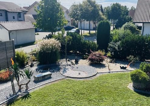 Der gepflegte Garten, blühend und glitzernd, lädt zum Verweilen ein und verstärkt das Gefühl von Ruhe und Erholung. Wenn Sie in Ihren Garten blicken, ist Fülle und Schönheit zu sehen. Ausblick ins Grüne, gleich dahinter öffnet sich das Panorama mit Blick auf den bayerischen Wald. Das Gefühl: nah am Leben – und gleichzeitig für sich.
