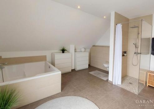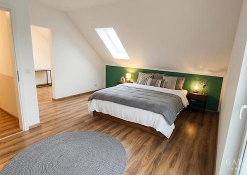 Im Obergeschoss befinden sich mehrere großzügige Zimmer, die flexibel als Schlaf-, Kinder- oder Arbeitszimmer genutzt werden können. Ein besonderes Highlight ist das moderne Badezimmer mit Walk-In-Dusche und großzügiger Badewanne, ideal zum Entspannen nach einem langen Tag.