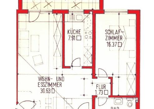 Vom Wohnraum gelangen Sie in die separate Küche von ca. 8 m², das geräumige Bad von ca. 8 m² (ausgestattet mit Wanne, Dusche und Waschmaschinenanschluss), den Abstellraum sowie in das schöne Schlafzimmer von ca. 17 m².