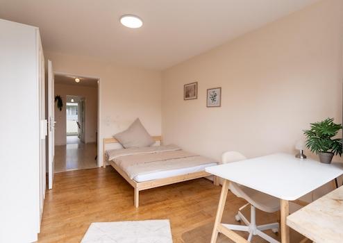 The available room number 3 is fully furnished and has a comfortable 1.40 m wide bed with mattress and duvet cover, a desk with chair, a ceiling lamp, and a wardrobe. The room has direct access to the balcony. The previous tenant is moving out at the end of April, so the room will be available from May.