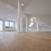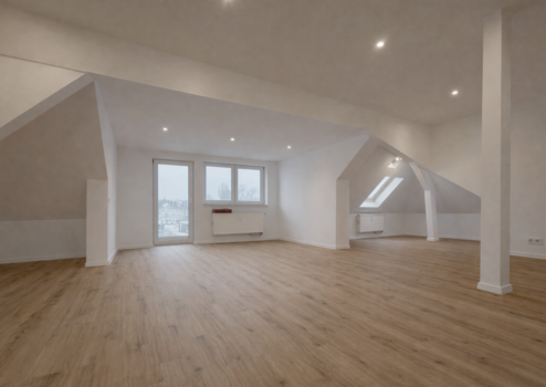 Der Charakter ist klar Loft-orientiert: großzügiger Raum, sichtbare Säulen, viel Licht, klare Linien. In der Mitte des Grundrisses wurde eine Gaube realisiert, an die ein Balkon angeschlossen wird. Der Balkon wird im Frühjahr 2026 fertiggestellt.