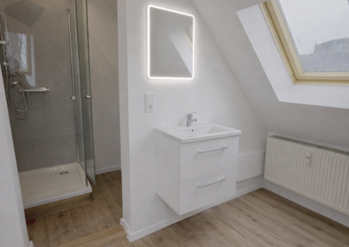 Das Bad ist zweigeteilt, sodass Waschmaschine und Wäschebereich separat untergebracht werden können – kein Technik- oder Wäschestapel im Wohnraum.