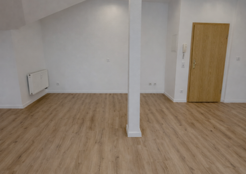 Die Wohnung verfügt über ca. 66 m² Nutzfläche. Aufgrund der Dachschrägen ergibt sich eine Wohnfläche von ca. 55 m² inkl. Balkon. Das Raumkonzept ist konsequent offen: Wohn-, Ess-, Koch- und Schlafbereich gehen fließend ineinander über. Trennwände gibt es nicht, lediglich das Badezimmer ist separat geschlossen.