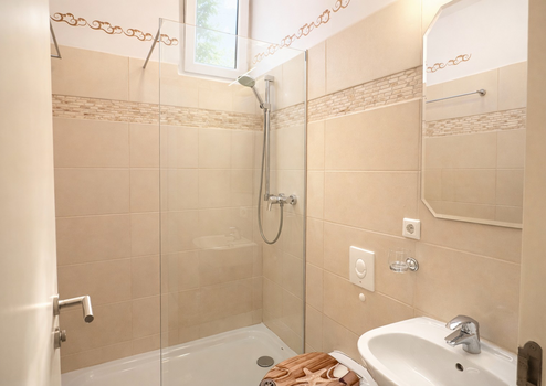 - Zweites Bad mit großer Dusche, wandhängendem WC und Waschtisch – ebenfalls hochwertig ausgestattet