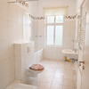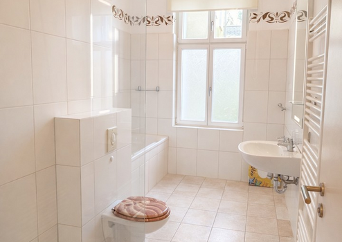 - Großzügiges Tageslichtbad mit Doppelbadewanne, großer Dusche, Waschtisch, wandhängendem WC und Handtuchheizkörper