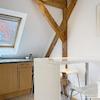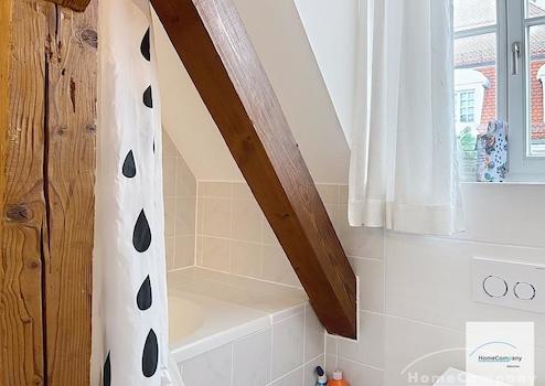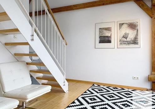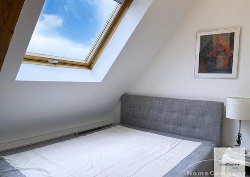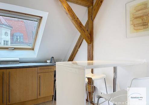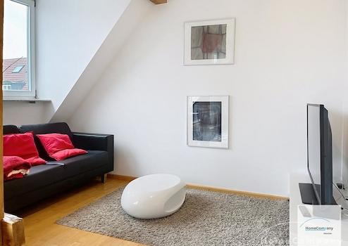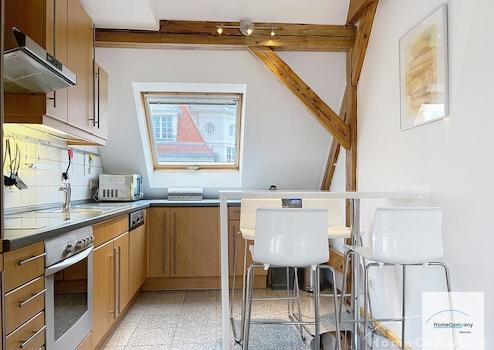 Helle, modern möblierte 1,5-Zimmer-Dachgeschoss-Maisonette-Wohnung mit Südbalkon in Schwabing. 5. OG. Im unteren Teil der Wohnung befinden sich der helle Wohnbereich mit Sofa und TV, das Badezimmer, sowie die offene Küche. Diese ist bestens ausgestattet mit allem, was man täglich benötigt, z.B. Mikrowelle, Spülmaschine. Essplatz für bis zu 4 Personen vorhanden. Badezimmer mit Badewanne und Wasch-Trockner-Kombination.