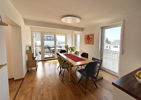 Herzstück der Wohnung ist der offen gestaltete Wohn-, Ess- und Küchenbereich mit einer Gesamtfläche von knapp 60 m². Von diesem aus betritt man den teilüberdachten Balkon, dessen sonnige Süd-/West-Ausrichtung ideale Voraussetzungen für entspannte Stunden im Freien und stimmungsvolle Sonnenuntergänge bietet - bei guter Sicht mit Alpen- und Seeblick.