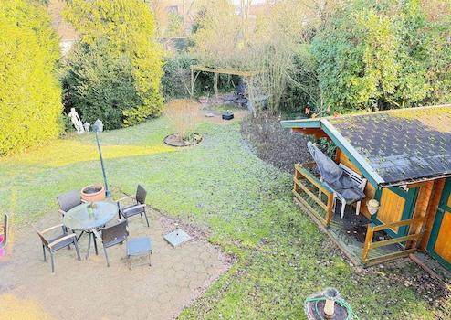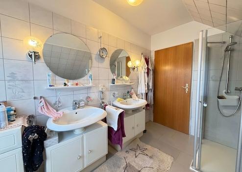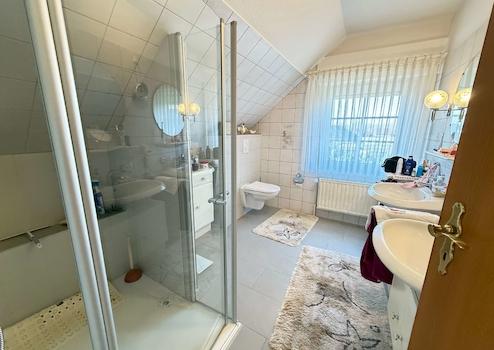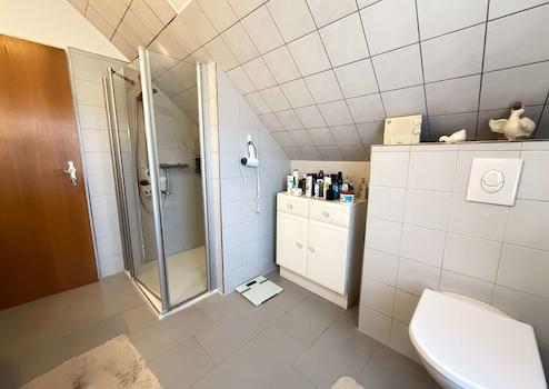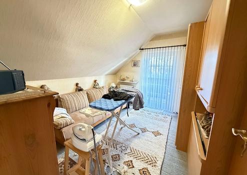 Im Obergeschoss stehen drei Schlafzimmer zur Verfügung, die flexibel als Elternschlafzimmer, Kinderzimmer, Gästezimmer oder Homeoffice genutzt werden können. Zwei der Schlafzimmer verfügen über einen direkten Zugang zum Balkon, von dem aus sich ein schöner Blick in die ruhige Nachbarschaft bietet. Das Badezimmer im Obergeschoss ist mit einer Dusche ausgestattet und gefliest. In den übrigen Räumen des Obergeschosses sorgen Teppichböden für eine angenehme Wohnlichkeit. Das Haus ist mit Sprossen-Kunststofffenstern mit Zweifachverglasung sowie Rollläden ausgestattet, die zu einem guten Wohnklima beitragen.