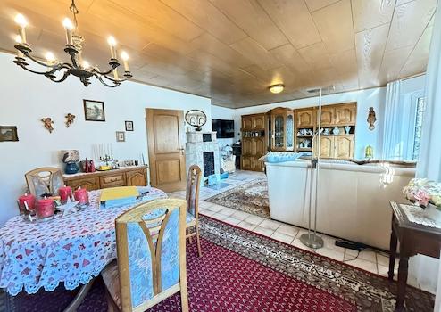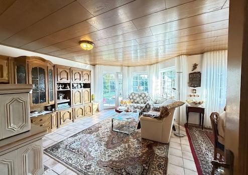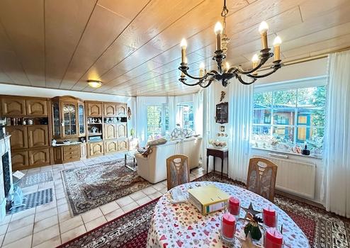 Bereits beim Betreten des Hauses wird deutlich, dass hier ein solides Zuhause mit angenehmer Wohnatmosphäre geschaffen wurde. Das Erdgeschoss bildet den Mittelpunkt des täglichen Lebens. Herzstück ist das großzügige Wohnzimmer mit charmantem Erkerausbau, der für viel Tageslicht sorgt und dem Raum eine besondere architektonische Note verleiht. Ein Kachelofen sorgt insbesondere in der kälteren Jahreszeit für eine behagliche Wärme und unterstreicht den wohnlichen Charakter des Hauses. Von hier aus besteht ein direkter Zugang zur Terrasse, die sich ideal für entspannte Stunden im Freien, Familienfeiern oder gesellige Abende eignet.