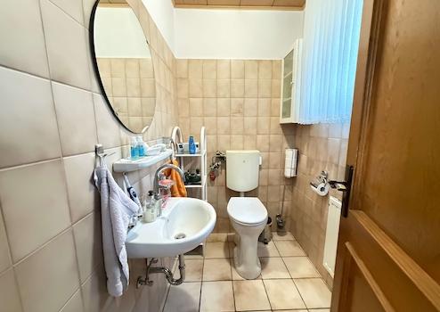 Die Bodenbeläge im Erdgeschoss sind mit pflegeleichten Fliesen ausgestattet. Ergänzt wird diese Wohnebene durch ein Gäste-WC, das den Grundriss sinnvoll abrundet.