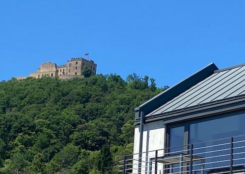 Das Anwesen liegt idyllisch in Weinbergrandlage mit Blick direkt über die Weinberge, das Hambacher Schloss und in die Rheinebene.