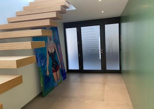 Für den Bau dieser großzügigen, modernen Villa wurden ausschließlich hochwertige Materialien verwendet. Die zu den Weinbergen gerichtete Hausfront ist komplett verglast. Somit hat man von jedem Raum aus einen herrlichen Blick auf die Weinberge, das Hambacher Schloß und die Rheinebene.
