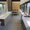 Das Masterschlafzimmer mit verglaster Sauna, Ruhebereich und Badezimmer mit Whirlpool