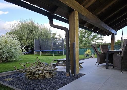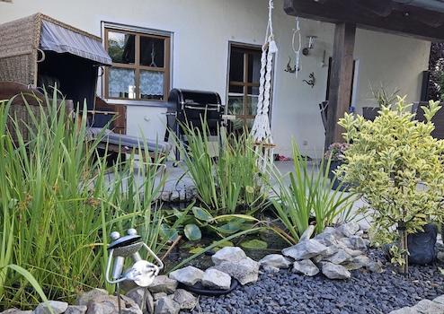 Der Außenbereich lädt zu gemütlichen Stunden ein. Sie finden hier einen idyllischen Garten mit kleinem Teich, zwei Terrassen sowie eine Garage mit Wallbox.