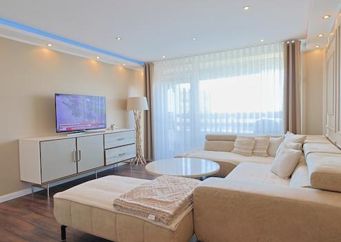 Diese exklusive und hochwertig sanierte Wohnung befindet sich in der 9. Etage der 1972 erbauten Wohnanlage. Die jeweiligen Wohnungen sind über das Treppenhaus oder auch den Fahrstuhl erreichbar. -Helles Wohnzimmer mit ...