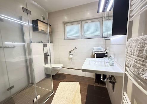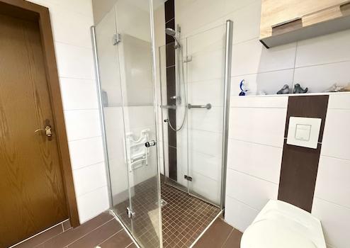 -- Das barrierearme Duschbad im EG bietet eine bodentiefe Dusche mit Faltglastüren und Sitz, einen modernen Waschtisch mit Spiegel und Möbelstück, ein Hänge-WC sowie einen Handtuchheizkörper.
