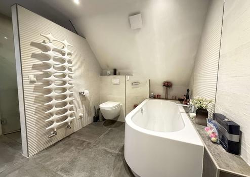 -- Das Designbad im Dachgeschoss ist mit einer eleganten Badewanne, zwei Waschtischen, einer ebenerdigen Dusche mit Glasabtrennung, Hänge-WC und hochwertigem Designer-Handtuchheizkörper ausgestattet – alles in zeitloser, moderner Optik.