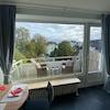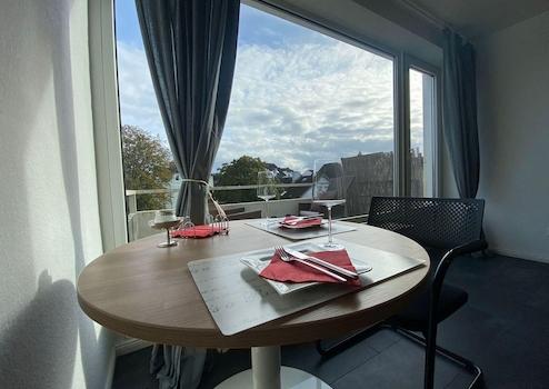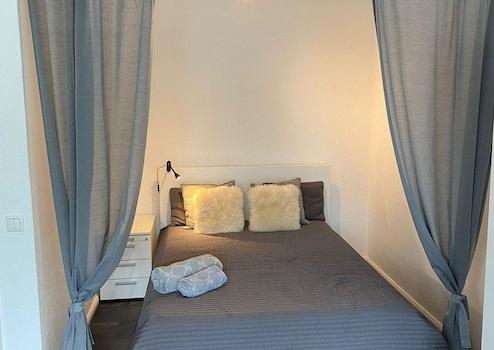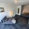 Das 25 qm große Wohn- und Schlafzimmer hat eine riesige Fensterfront zum Balkon und verfügt über eine Bettnische mit 140x200 cm breitem Bett, das durch einen Vorhang optisch vom Rest des Zimmers getrennt werden kann. Der 43 Zoll große Smart-TV auf einem Tisch mit Rollen kann bequem so gedreht werden, dass er vom Bett, dem gemütlichen Recamiére oder dem Ess – und Arbeitstisch gesehen wird.