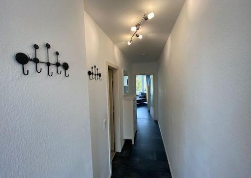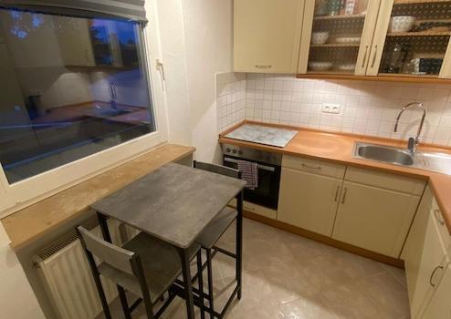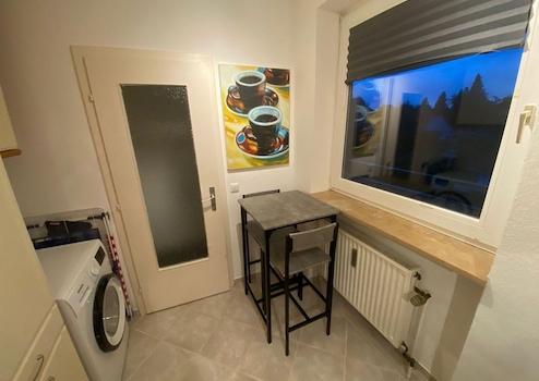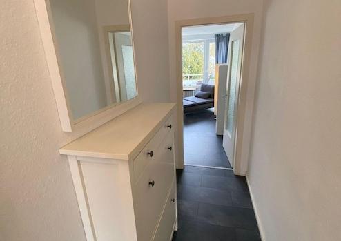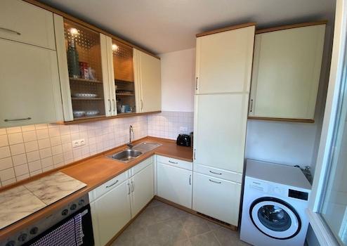 Über die Wohnungstür gelangt man in einen großzügigen Flur mit Garderobe und Schuhschrank. Von ihm gehen die Küche mit Waschmaschine, Herd mit Ceranfeld, Mikrowelle und Kühlschrank mit Tiefkühlfach ab. Hier gibt es auch eine hübsche Sitzgelegenheit zum Essen oder Arbeiten. In der Küche ist alles vorhanden, was man zum Kochen benötigt (Geschirr, Besteck, Töpfe, Toaster, Wasserkocher etc.)